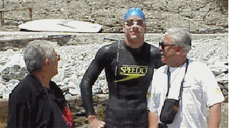L'étape d'aujourd'hui est une des plus courtes : 8,5 km " seulement " selon les mesures GPS (Global Positionnement System). Comme l'accostage dans la Marine de Canelle n'est pas possible, l'équipe bateau est partie de CENTURI Port à 8 heures 10 avec le nageur. La préparation de celui-ci : examens médicaux, habillage, a donc eu lieu en mer. A 9 heures 15, Cyril se met à l'eau. Contrarié par un vent de terre assez fort et des courants contraires, il pose le pied dans la Marine de Negru après 2 heures 37 minutes et 18 secondes d'une étape qui s'avère finalement moins facile que prévu. Il est accueilli par quelques habitants du village et M. BONCOMPAGNI Maire d'OLMETA DI CAPO CORSO qui le félicite et lui présente ses vœux de réussite pour les prochaines étapes.